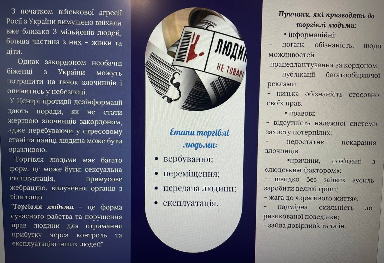 Так, в рамках заходів приурочених до Європейського дня боротьби з торгівлею людьми, проведено години психолога з використання елементів тренінгу. Метою цих заходів є  підвищення обізнаності студентсько-учнівської молоді про сучасні прояви торгівлі людьми, а також формування навичок безпечної поведінки в умовах воєнного часу.
